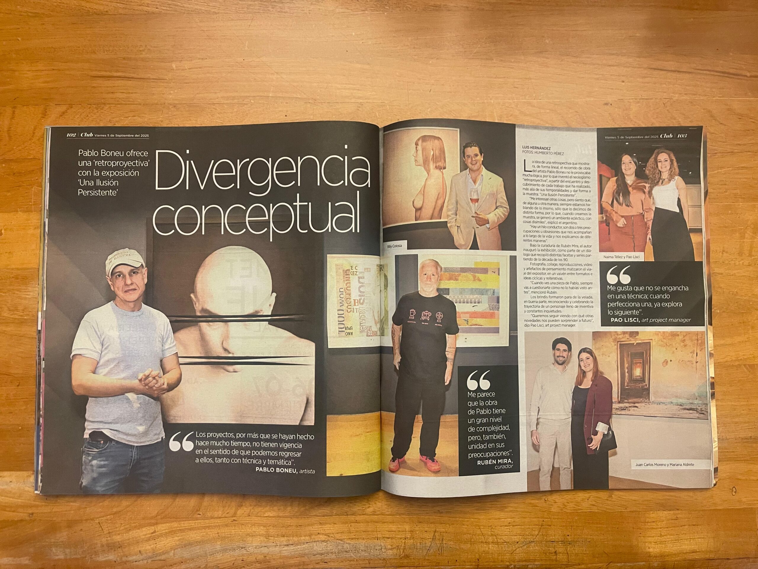 “El concepto de Retroproyectiva fue creado para Boneu, pero también proviene de la dinámica de su obra. A diferencia de una retrospectiva, esta modalidad no despliega linealmente, sino que superpone capas de transparencias. No hay obras aquí sino proyectos, hacer en proceso, inacabado, mutante, que se transforma con el deseo y proyecta la fiesta del ahora hacia cualquier dimensión temporal”