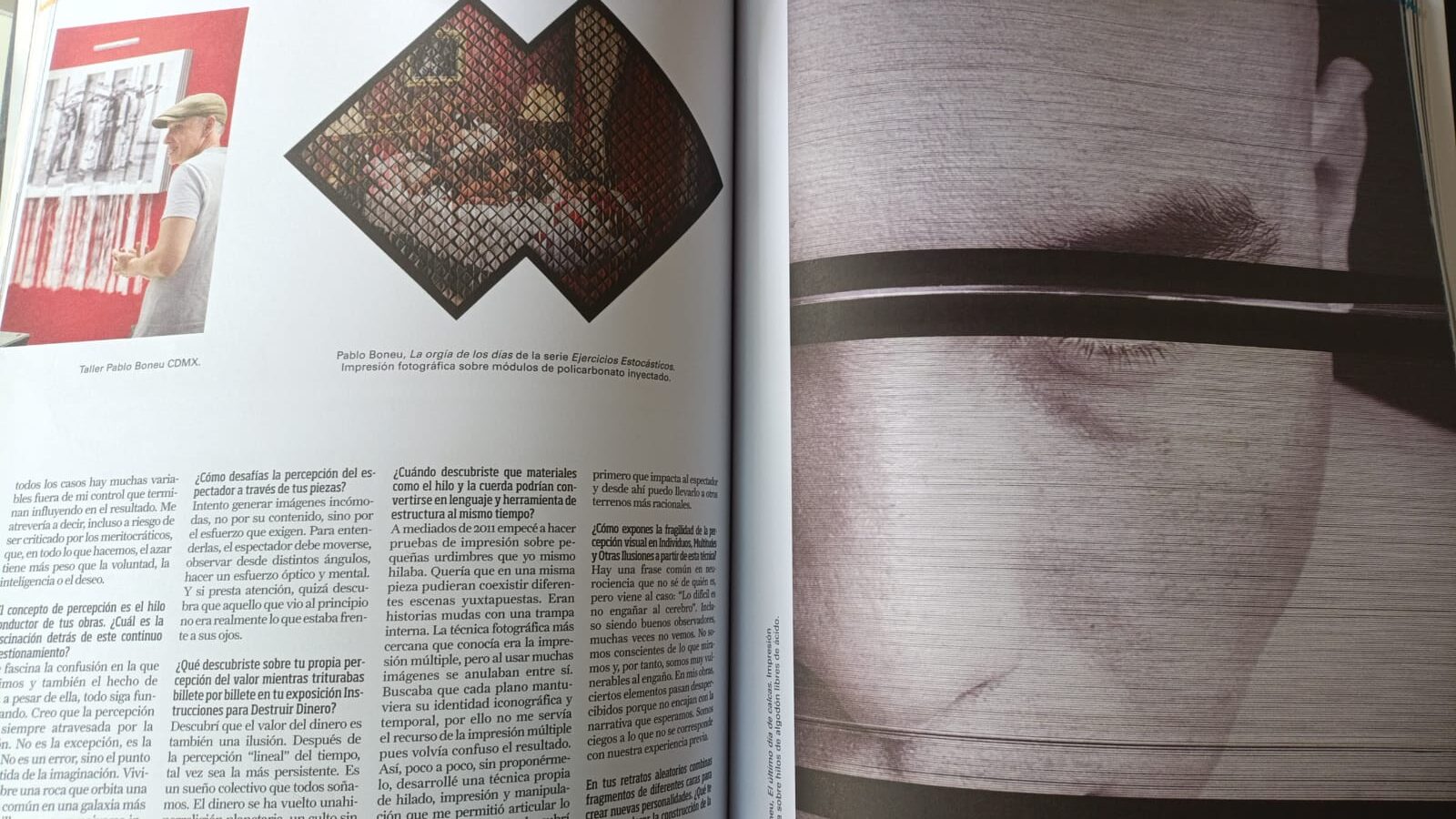 Monelle, ensayo de destrucción es una instalación creada en exclusiva para Zona Maco 2026. Está compuesta por dos obras principales: El retrato de Monelle, emblemática pieza del proyecto Urdimbre del retrato, que en base a la técnica de fotografía sobre hilos Boneu viene desarrollando desde 2012 y una nueva creación basada en esta obra, en la cual se profundizan los aspectos escultóricos en base a la deconstrucción de la imagen.