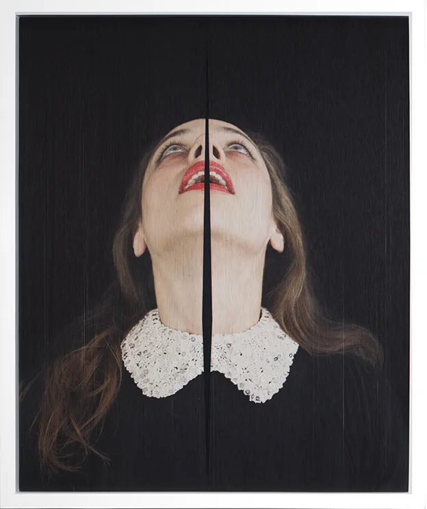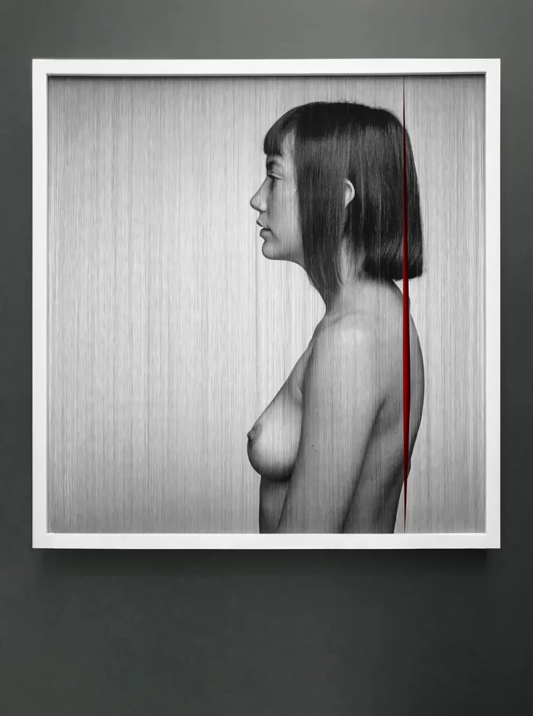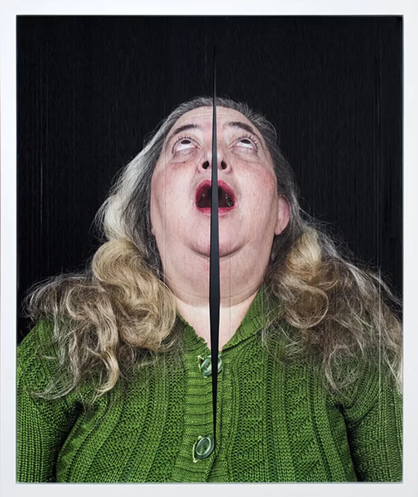Fotografía impresa sobre hilos yuxtapuestos en dos bastidores e intervenidos manualmente.