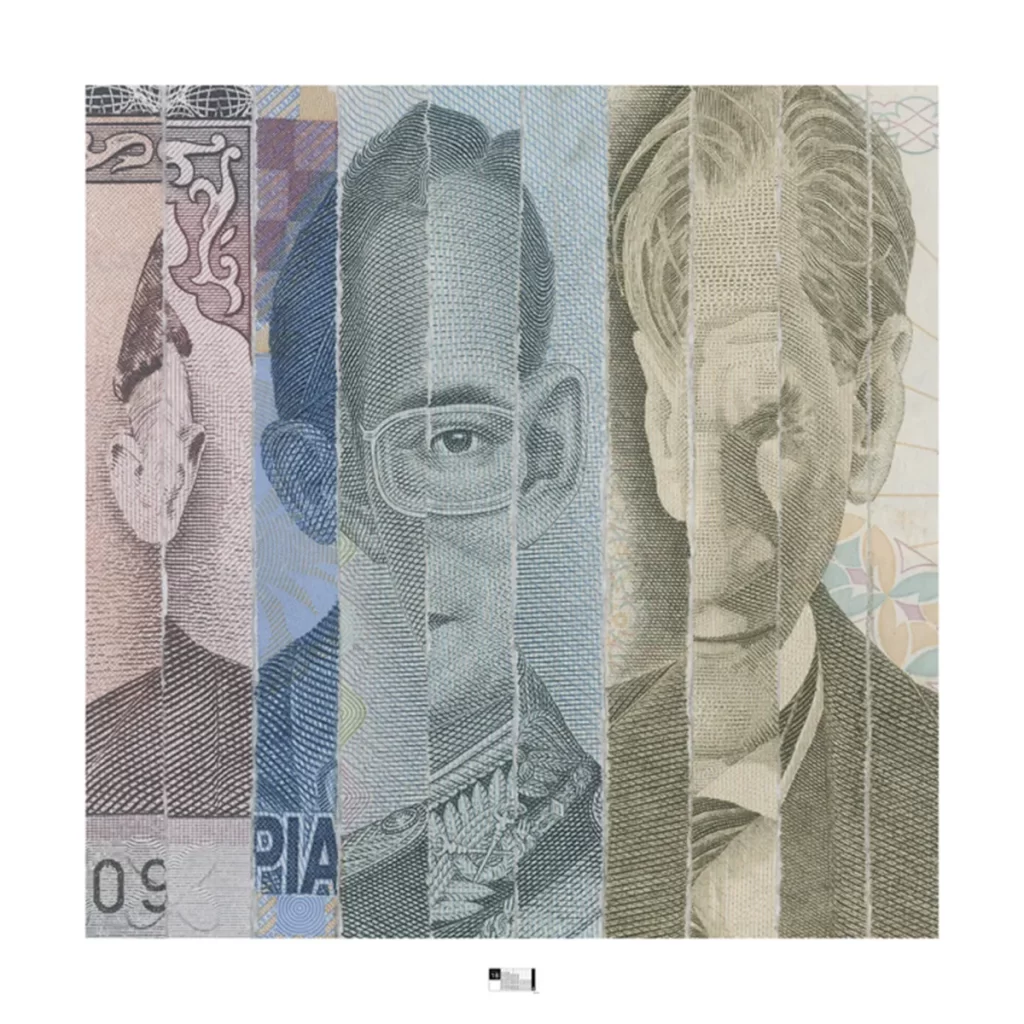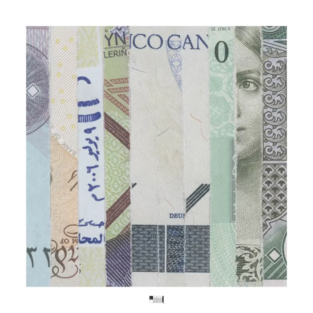 - Reproducción fotográfica de collage realizado con dinero triturado.