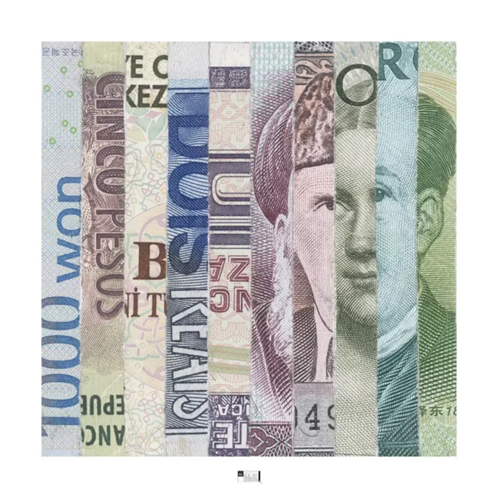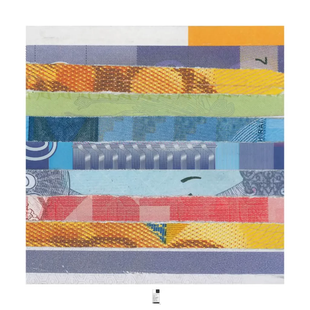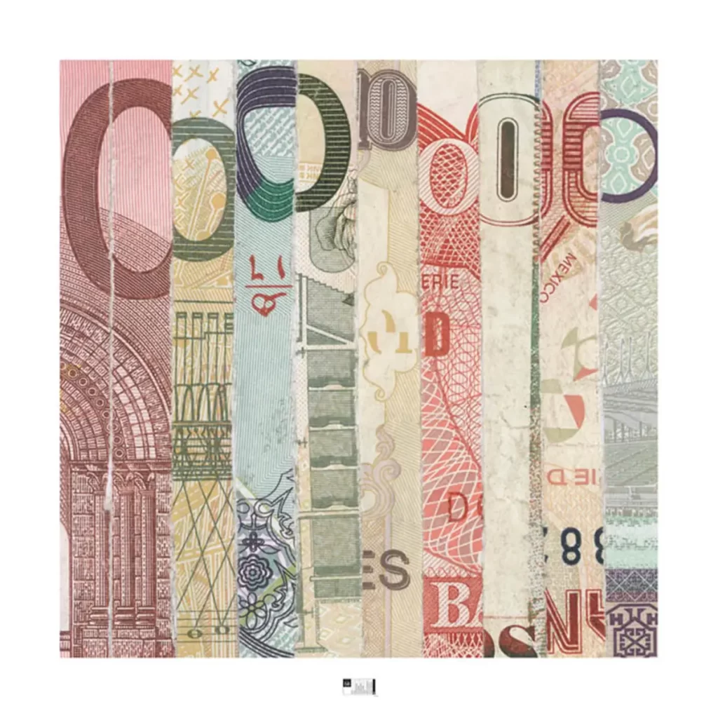 Reproducción fotográfica de collage realizado con dinero triturado.