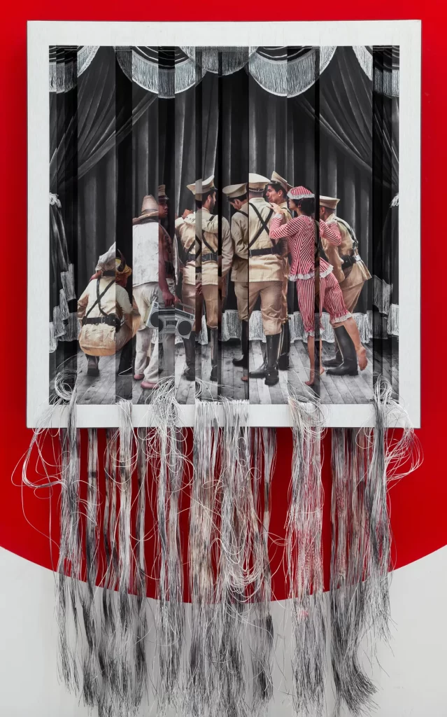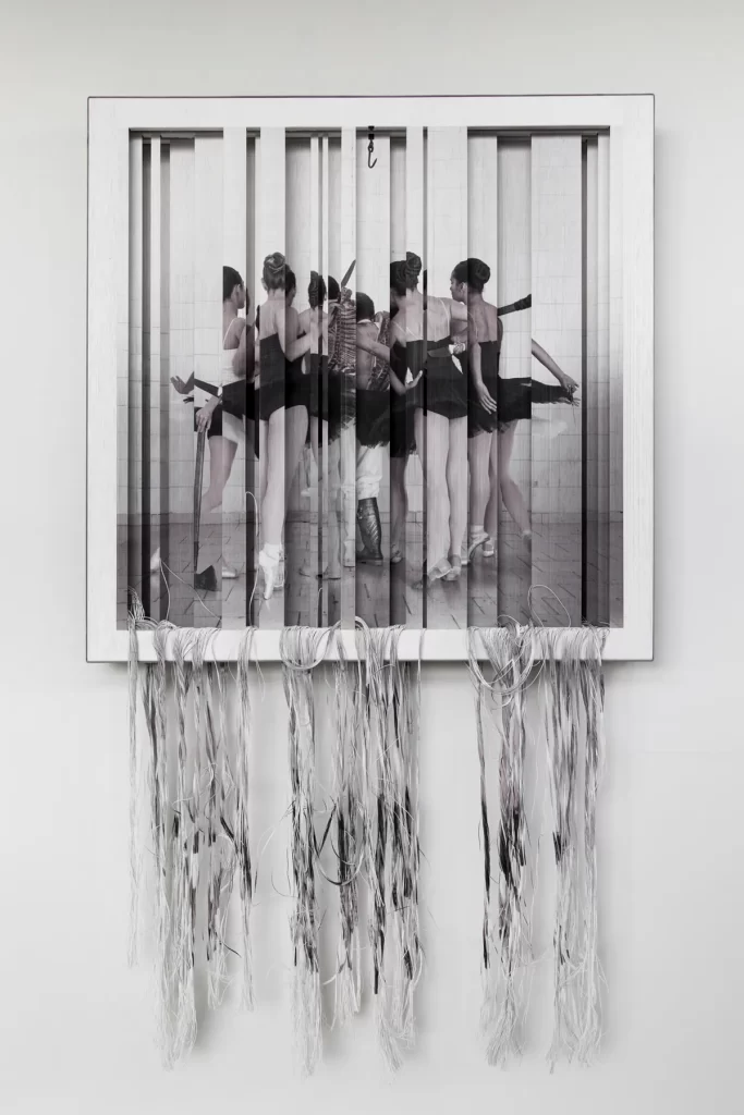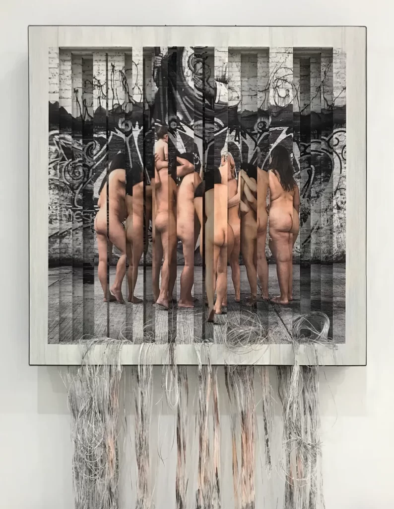 Fotografía impresa sobre hilos yuxtapuestos en cuatro bastidores e intervenidos manualmente.