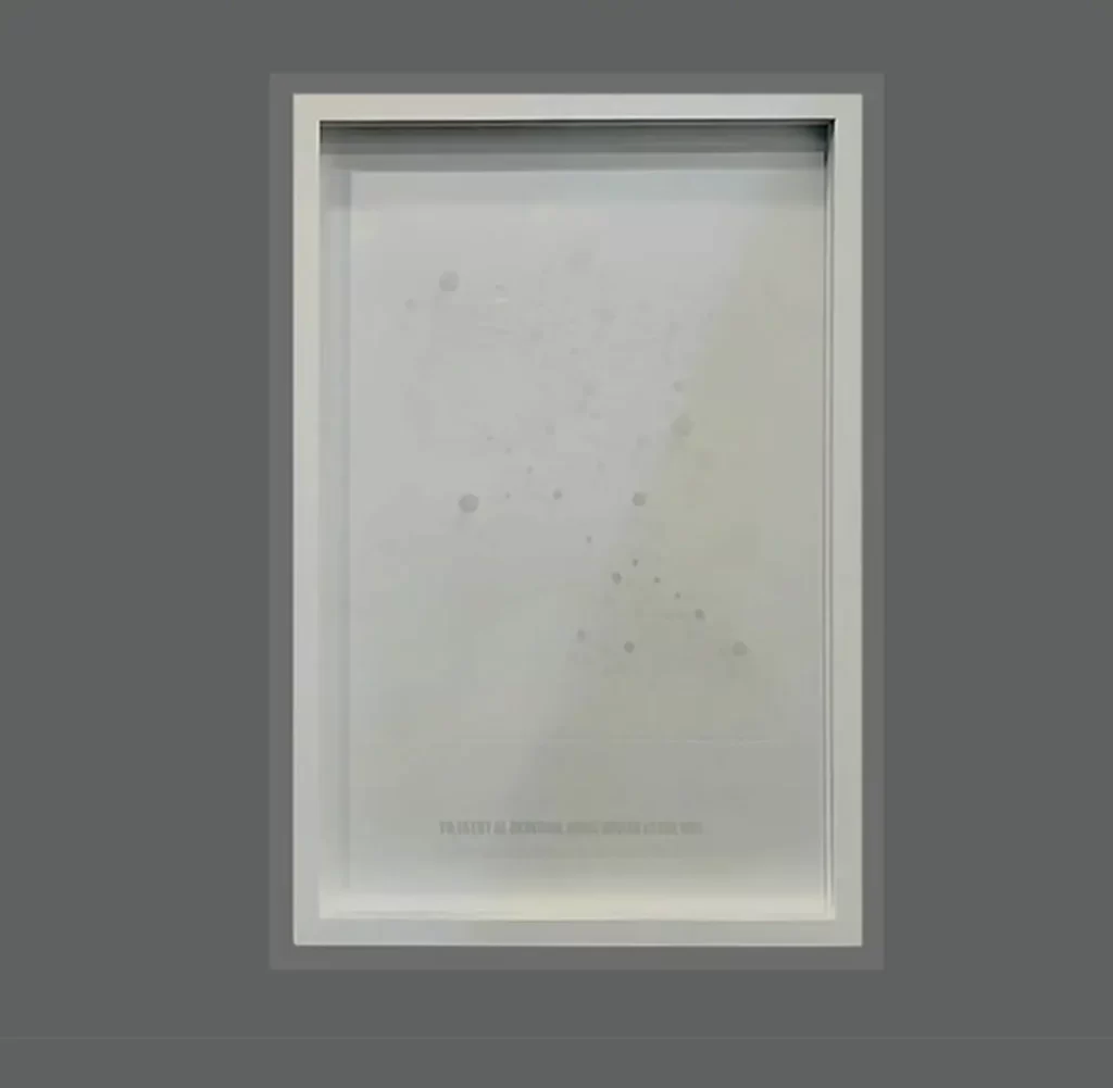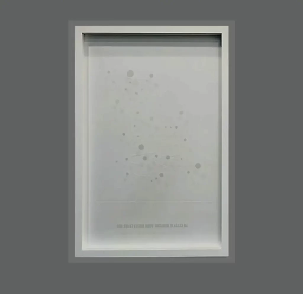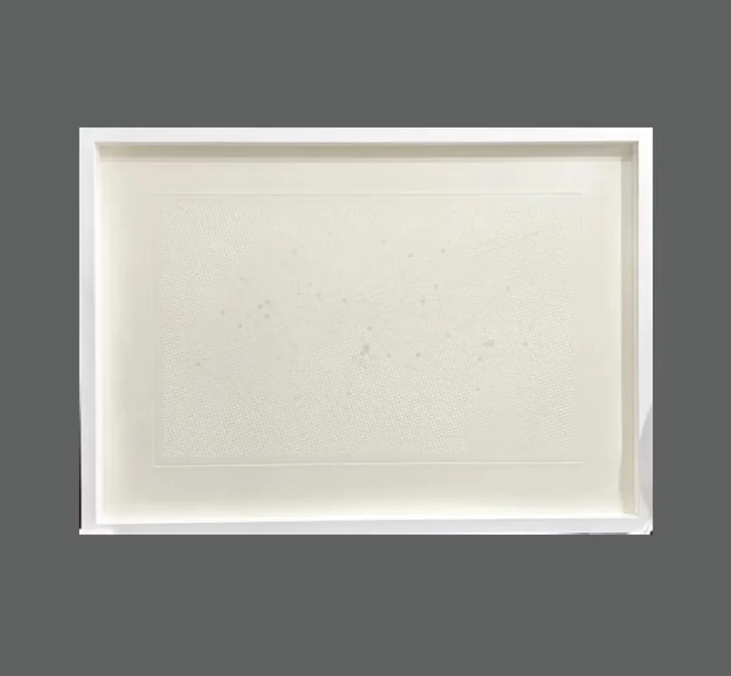 Gofrado sobre papel de algodón y serigrafía sobre vidrio.