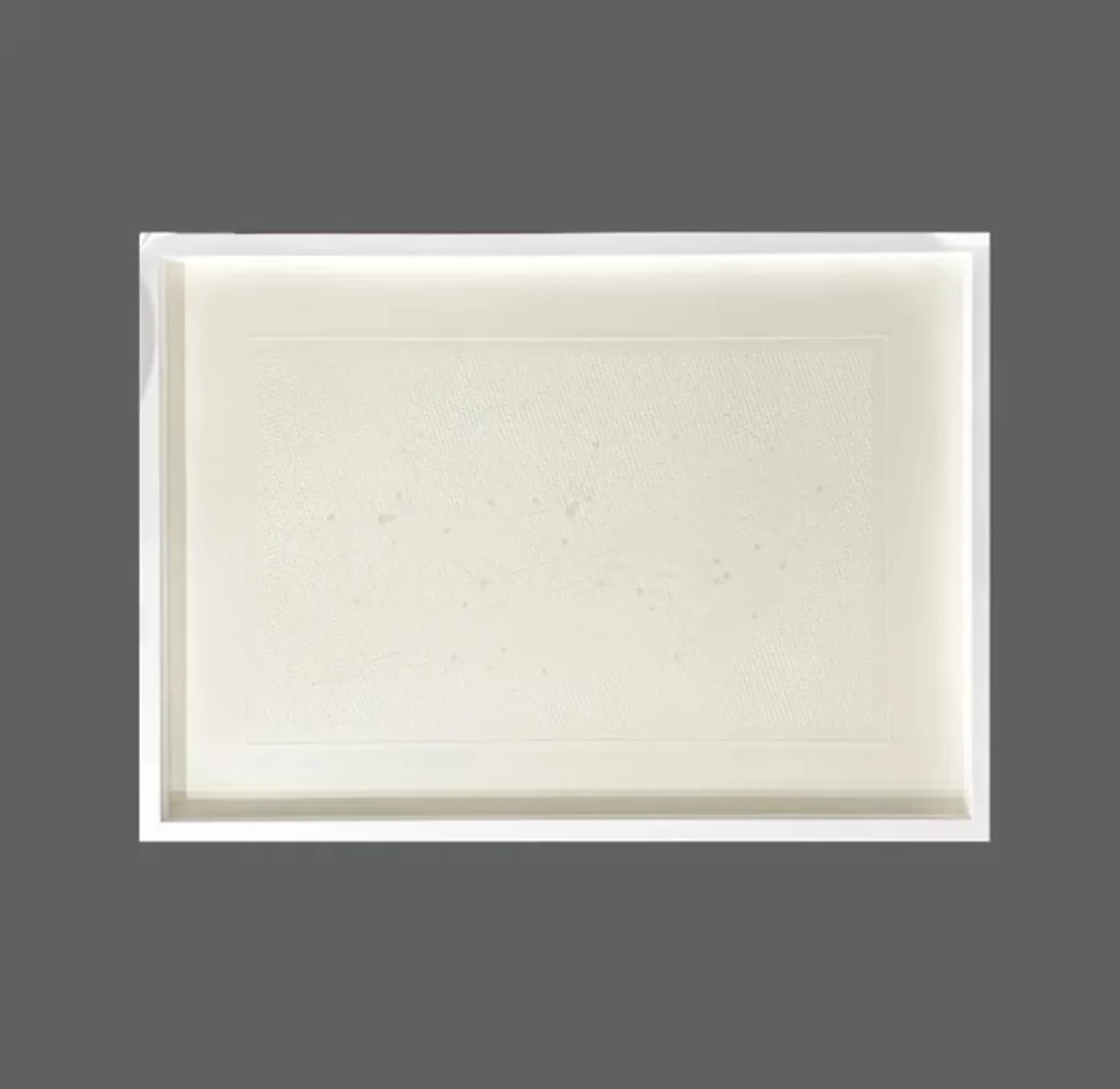 - Gofrado sobre papel de algodón y serigrafía sobre vidrio.